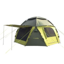 Данная модель имеет два больших входа с противоположных сторон и по большому окну на боковых стенках. Причем размер этих окон практически равен размеру боковой стенки. Входы шатра и окна на стенках оснащены противомоскитной сеткой и дублируются ветро/водозащитными стенками. В комплекте с шатром идут две стальные стойки. Так что при желании вы можете поставить одну из стенок входа как козырек. По низу шатра идет ветрозащитная юбка.