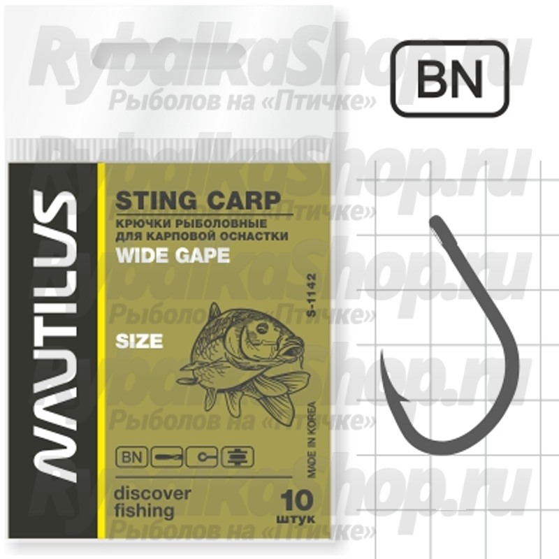 Крючок Nautilus Sting Carp Wide Gape S-1142 Классический карповый крючок из мощной кованой проволоки с широким поддевом. Прекрасно сочетается с волосяными бойловыми оснастками и допускает применение как тонущих, так и плавающих приманок.