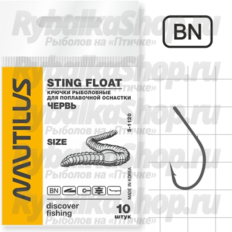 Крючок Nautilus Sting Float Червь S-1120. Тонкий кованый крючок со средней длиной цевья и микробородкой на нем для удержания живой насадки. Крючок ориентирован в первую очередь для применения с различными видами червей.