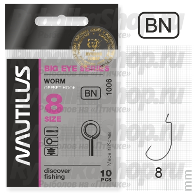 Крючок офсетный Nautilus Offset Big Eye Series Worm 1006. Прочный кованый крючок, отличающийся тонкой прово- локой и прямым жалом. Идеально подходит для оснащения деликатных силиконовых приманок. Для увеличения степе- ней свободы и подвижности в оснастке, крючок имеет ушко увеличенного диаметра.