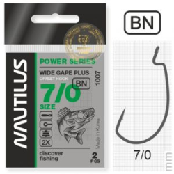 Nautilus Offset Power series Wide Gape Plus 1007. Очень мощный кованый крючок из толстой (2Х) проволоки с прямым жалом. Высокое содержание углерода в стали гаран- тирует мощность и жесткость проволоки, которая при этом хорошо поддается закалке.