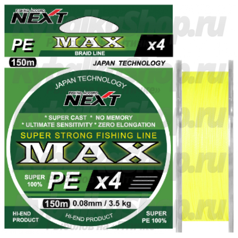 Шнур Next MAX PEx4 150m желтый-флюо 0.30mm, 21.0kg