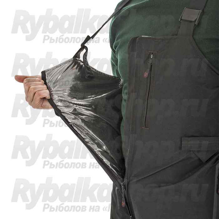 На высоком теплом полукомбинезоне в наколеннике есть специальные съемные вставки из ППЭ. Наколенник усилен дополнительно прочной термоустойчивой пленкой Protectfilm австрийского производства. Низ полукомбинезона имеет перфорацию на ткани для быстрого вытекания воды.