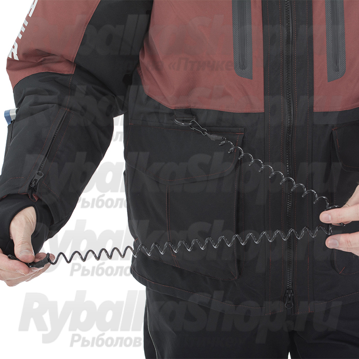 Высокий воротник куртки защищает от ветра. Удобный глубокий капюшон с жестким ветрозащитным козырьком. Глубокие утепленные карманы на куртке специально созданы для размещения всего необходимого для рыбалки и согрева рук. К куртке пристегивается дополнительный карман на разъемной молнии с пластиковой коробкой для приманок размером 22*12*2см. На рукавах есть специальные крепления для спасалок (идут в комплекте с костюмом) для оперативного использования в случае падения со льда в воду. Неопреновые манжеты обеспечат максимальный комфорт рукам при соприкосновении с водой. Перфорация ткани на спинке костюма и рукавах способствует быстрому вытеканию накопившейся воды в куртке, что облегчает выход из воды при случайном падении. Внутри куртки на подкладе - влагостойкий карман для обеспечения сохранности гаджетов.