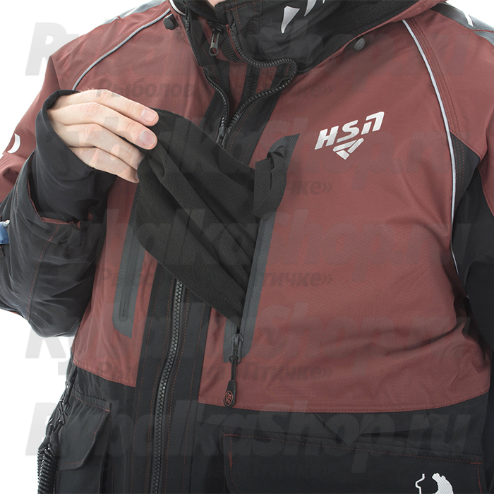 Высокий воротник куртки защищает от ветра. Удобный глубокий капюшон с жестким ветрозащитным козырьком. Глубокие утепленные карманы на куртке специально созданы для размещения всего необходимого для рыбалки и согрева рук. К куртке пристегивается дополнительный карман на разъемной молнии с пластиковой коробкой для приманок размером 22*12*2см. На рукавах есть специальные крепления для спасалок (идут в комплекте с костюмом) для оперативного использования в случае падения со льда в воду. Неопреновые манжеты обеспечат максимальный комфорт рукам при соприкосновении с водой. Перфорация ткани на спинке костюма и рукавах способствует быстрому вытеканию накопившейся воды в куртке, что облегчает выход из воды при случайном падении. Внутри куртки на подкладе - влагостойкий карман для обеспечения сохранности гаджетов.