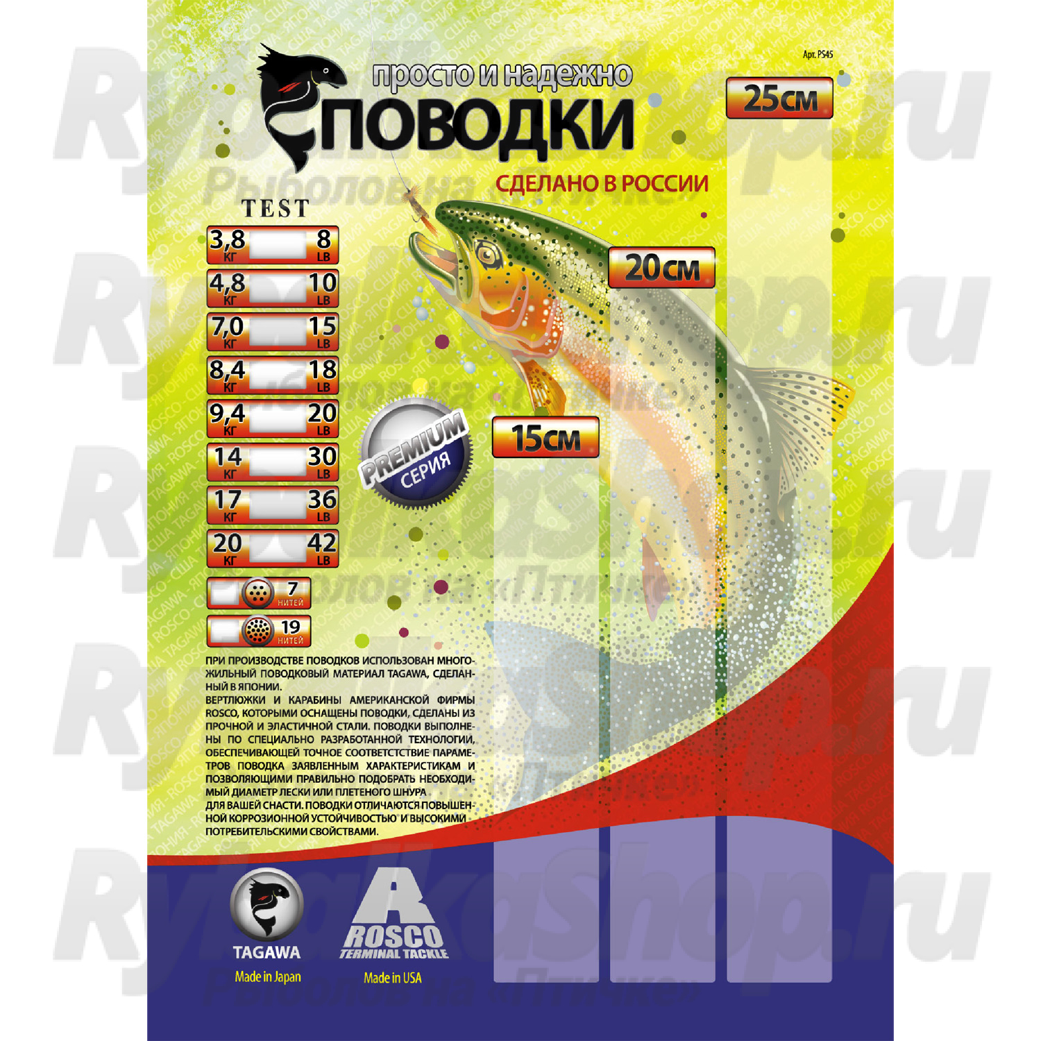 При производстве поводков Premium 7 нитей PS3-7 использован многожильный поводковый материал Tagawa, сделанный в Японии. Вертлюжки и карабины американской фирмы ROSCO, которыми оснащены поводки выполнены из прочной и эластичной стали. поводки выполнены по специально разработанной технологии, обеспечивающей точное соответствие параметров поводка заявленным характеристикам и позволяющее правильно подобрать необходимый диаметр лески или плетеного шнура для вашей снасти. Поводки отличаются повышенной карозийной устойчивостью и высокими потребительскими свойствами.