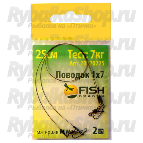 Поводок Fish Season AFW 1Х7 применяется при ловле хищной рыбы и ставится между основной леской (плетеным шнуром) и приманкой, защищая леску от перекусывания (или перетирания) острыми зубами хищной рыбы. Основная леска (плетеный шнур) привязывается (крепится) к поводку за ушко вертлюжка, а застежка служит для присоединения приманки.
