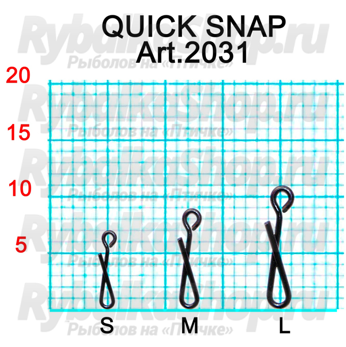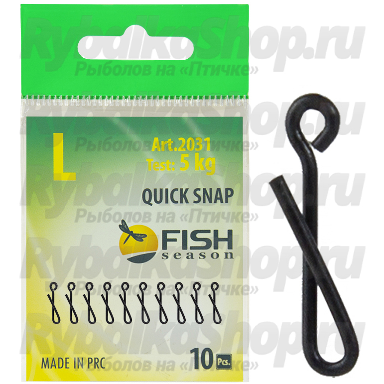 Fish Season Quick Snap - миниатюрная застежка для любителей ловли на ультралайт и зимней рыбалки. Благодаря крохотным размерам и ничтожному весу, не оказывает влияния на игру самых легких приманок, но при своих габаритах имеет высокую надёжность к нагрузкам. Ее особенностью является отсутствие замка как такового: его функцию выполняет надежно прижимающийся упругий хвостик петли. Таким образом, маленькую приманку, даже с самой крохотной крепежной петлей, легко одеть и снять, при этом самопроизвольно освободиться она не сможет.