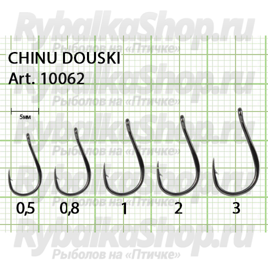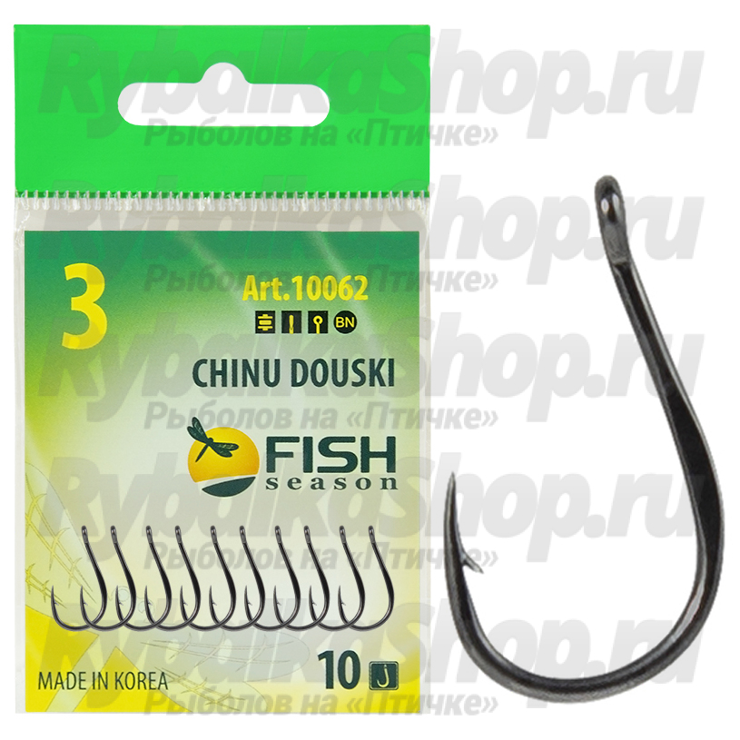 Модель Fish Season Chinu Douski-Ring BN (10062) имеет зацепистый загиб, что уменьшает процент сходов. В отличие от обычного CHINU, у данной модели раскована задняя часть поддева. Это даёт увеличение жесткости. Крючки данной модели предназначены для ловли карпа, амура, сазана, карася, леща. Идеально подходит для использования крупных растительных насадок.