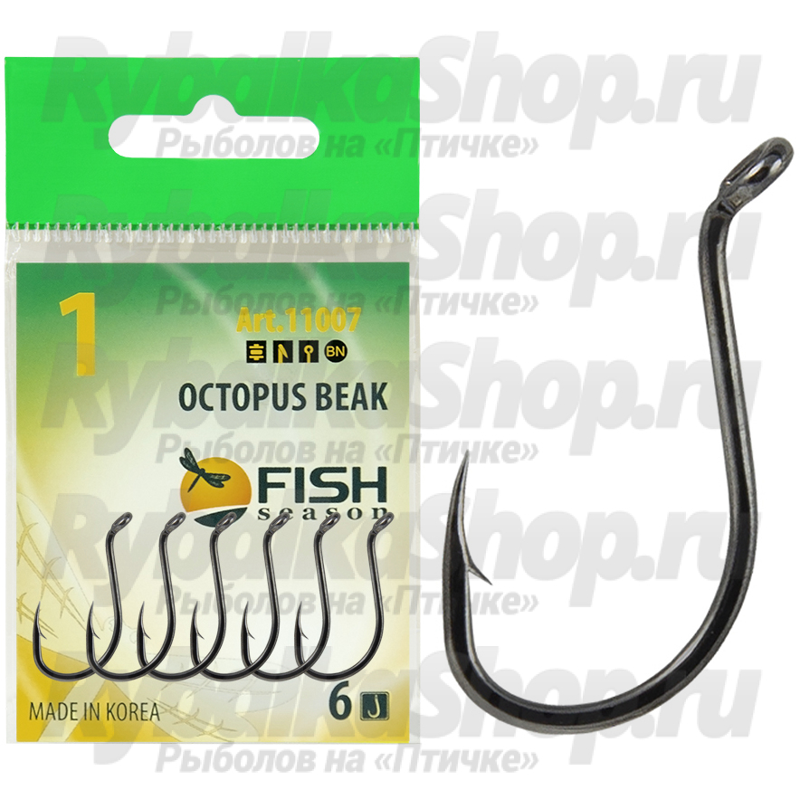 Серия Fish Season Octopus Beak (11007) с успехом используется в «вооружении» самых разнообразных донных снастей – пикеров, фидеров, тривиальных закидушек на основе металлических спиннингов, подпусков и переметов. Несмотря на то, что крючки наделены чрезвычайной прочностью и надежностью, они позволяют использование самого широкого спектра насадок, включая и самые нежные.