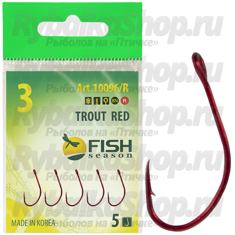 Серия крючков Fish Season Trout Red (10096R), рекомендованная для оснащения различных типов блесен, в том числе, и для отвесного блеснения. Крючки характеризуются крепежным колечком большого диаметра, удлиненным цевьем, широким чуть скошенным круглым загибом, миниатюрной бородкой. Два вида покрытия – RED (красное) и Black NICKEL (черное).