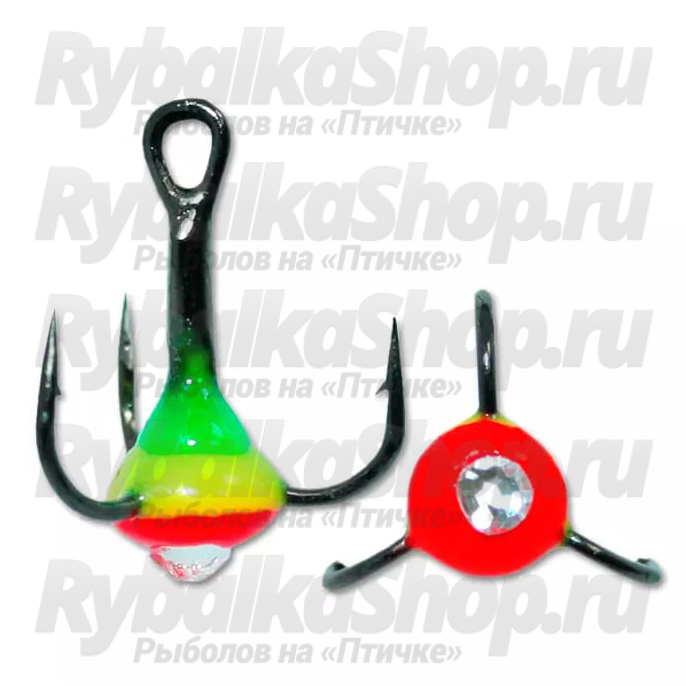 Крючок Тройник "Капля" Vido Craft №4, цвет 30 зелено-желто-красный+белый страз, VD-092C (BN), 10 шт/уп