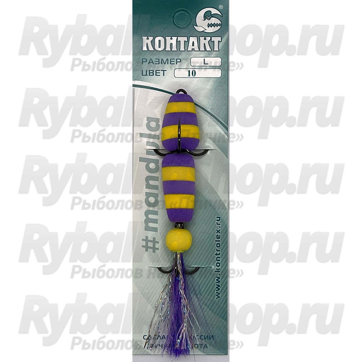 Мандула - полиуретановая приманка фирмы Контакт представляет из себя двусоставную модель с двумя тройниками. Цевье переднего тройника скрыто в пористом материале, а задний тройник, как и вторая подвижная часть, прикреплен шарнирно. Задний тройник имеет опушку из цветного блестящего люрекса для дополнительного привлечения внимания рыбы. На данный тип приманок отлично ловятся судак, щука и окунь.