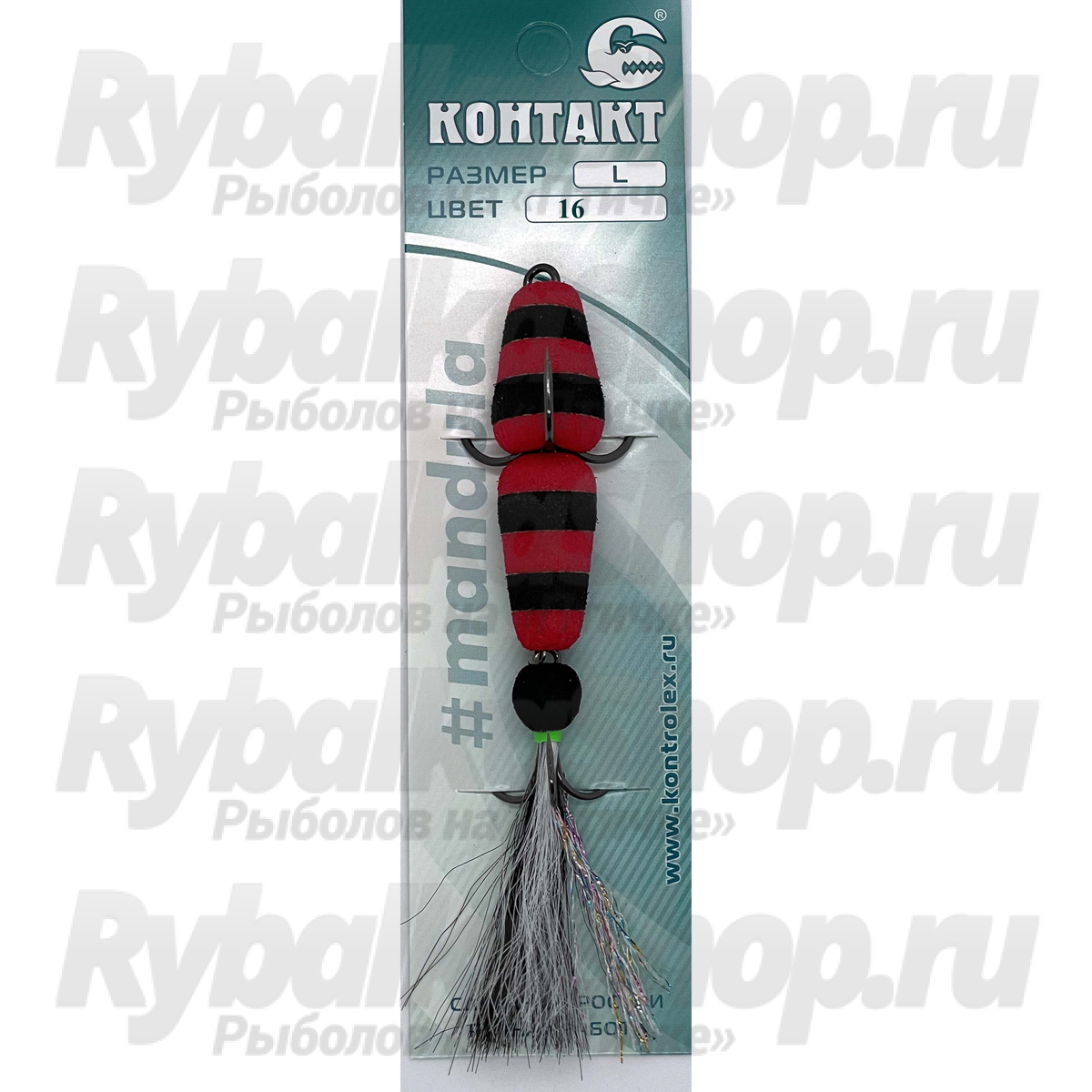 Мандула - полиуретановая приманка фирмы Контакт представляет из себя двусоставную модель с двумя тройниками. Цевье переднего тройника скрыто в пористом материале, а задний тройник, как и вторая подвижная часть, прикреплен шарнирно. Задний тройник имеет опушку из цветного блестящего люрекса для дополнительного привлечения внимания рыбы. На данный тип приманок отлично ловятся судак, щука и окунь.