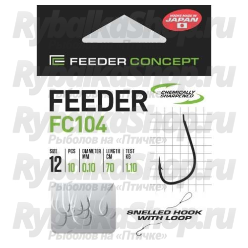 FC Feeder FC104 с поводком - серия готовых для использования поводков с крючками предназначена для ловли рыбы фидером. Длина поводка составляет 70 см. Размеры крючков внутри серии изменяются от 12 до 4 номера по международной классификации. Соответственно размеру крючка изменяется и диаметр поводка (от 0.10 до 0.18 мм). И если миниатюрные крючки на тонкой леске предназначены для ловли мелкой рыбы, то крупные крючки с прочной леской легко справятся и с трофейными экземплярами.