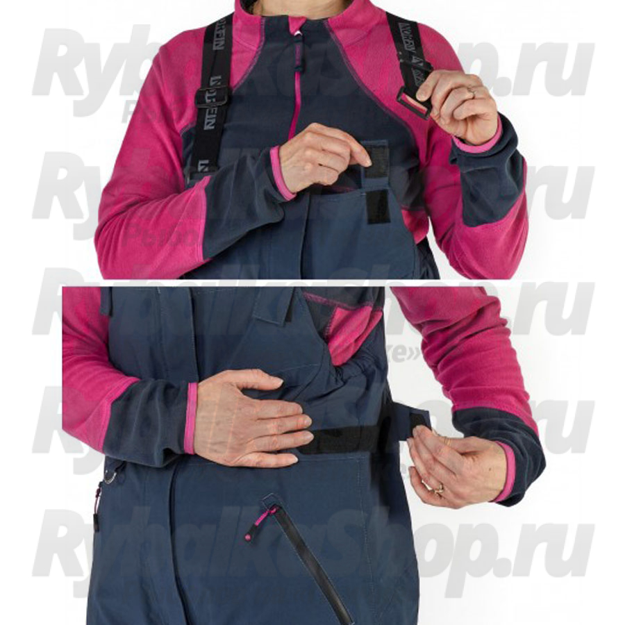 Полукмбинезон хорошо садится по фигуре за счёт анатомического кроя, также индивидуальную посадку помогут подобрать регулируемые лямки и ремешки в талии. По низу брючин есть расширители на молниях и застёжке-липучке. Это заметно облегчает переобувание, а также позволяет зафиксировать штаны поверх ботинок. Дополнительную защиту от снега выполняют специальные противосугробные манжеты внутри штанин.