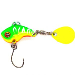Совсем небольшое высокое и плоское тело приманки массой 18 грамм продолжается прицепами: кольцами, вертлюжком и округлым лепестком с подчеркнутым цветовым нюансом.