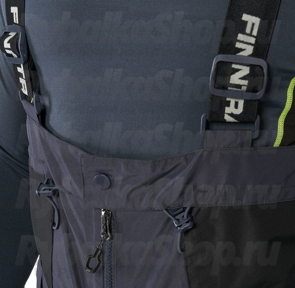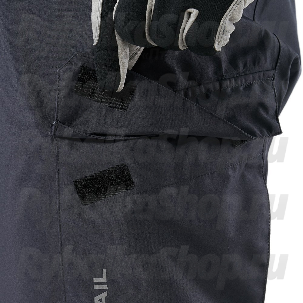 - Низ полукомбинезона снабжен боковыми влагозащитными молниями и патами с фиксацией на кнопку для регулировки объёма.