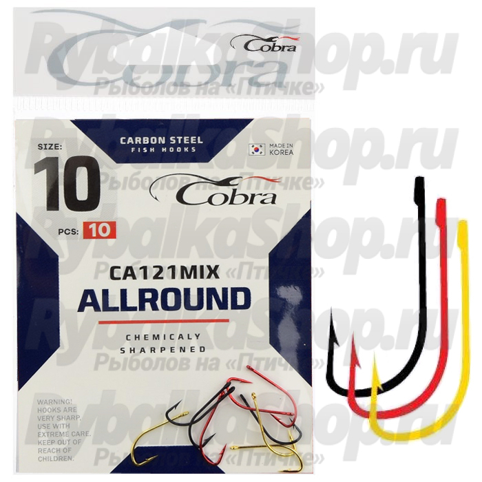 Cobra CA121MIX Allround - серия крючков, которая имеет идеальную форму округлого затылка, прямого лба, среднего по размеру цевья и удлиненного жала с бородкой. Эти детали формы делают эти крючки универсальными в использовании. Особо актуально их использование при подборе крючка для ловли на незнакомом водоеме. Ими можно ловить практически на всех водоемах, со всеми типами насадок и по всем видам рыб. Главное правильно подобрать размер крючка под условия ловли и ожидаемую рыбу. Представленный в серии широкий размерный ряд позволит осуществить этот процесс без проблем.