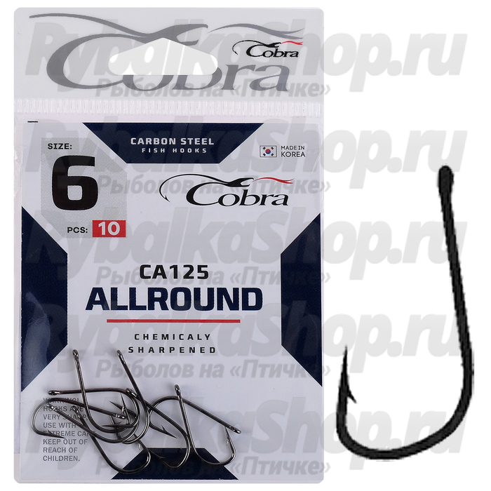 Cobra CA125 Allround - серия крючков, которая имеет идеальную форму округлого затылка, прямого лба, среднего по размеру цевья и удлиненного жала с бородкой. Эти детали формы делают эти крючки универсальными в использовании. Особо актуально их использование при подборе крючка для ловли на незнакомом водоеме. Ими можно ловить практически на всех водоемах, со всеми типами насадок и по всем видам рыб. Главное правильно подобрать размер крючка под условия ловли и ожидаемую рыбу. Представленный в серии широкий размерный ряд позволит осуществить этот процесс без проблем.