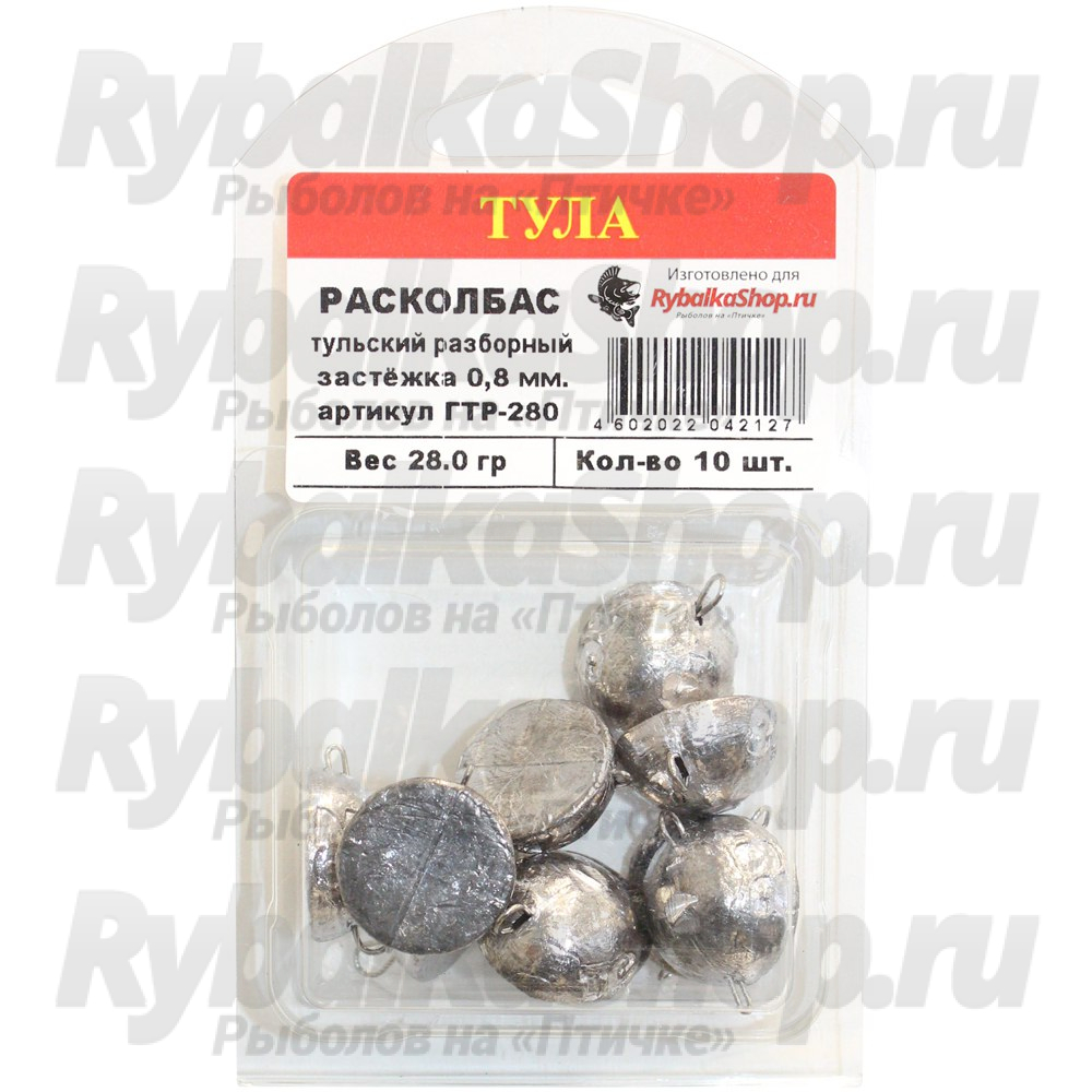 Тула Груз "Расколбас" - неокрашенный разборный груз. "Расколбас" предлагается в широком диапазоне веса: от 4 до 40 грамм. Застежка 0.8мм. Разборные грузы применяются для оснасток с офсетными крючками. Благодаря удачной конструкции, очень просто и быстро возможно осуществить как замену самого груза в оснастке, так и смонтированного офсетного крючка.