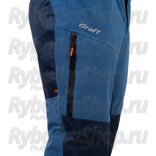 Задняя часть пояса брюк Graff – на резинке. Лёгкий вес, удобный крой, проклеенные швы, эргономичность карманов делают этот костюм очень комфортным для использования даже в экстремальных погодных условиях, защищая его обладателя от дождя и ветра.