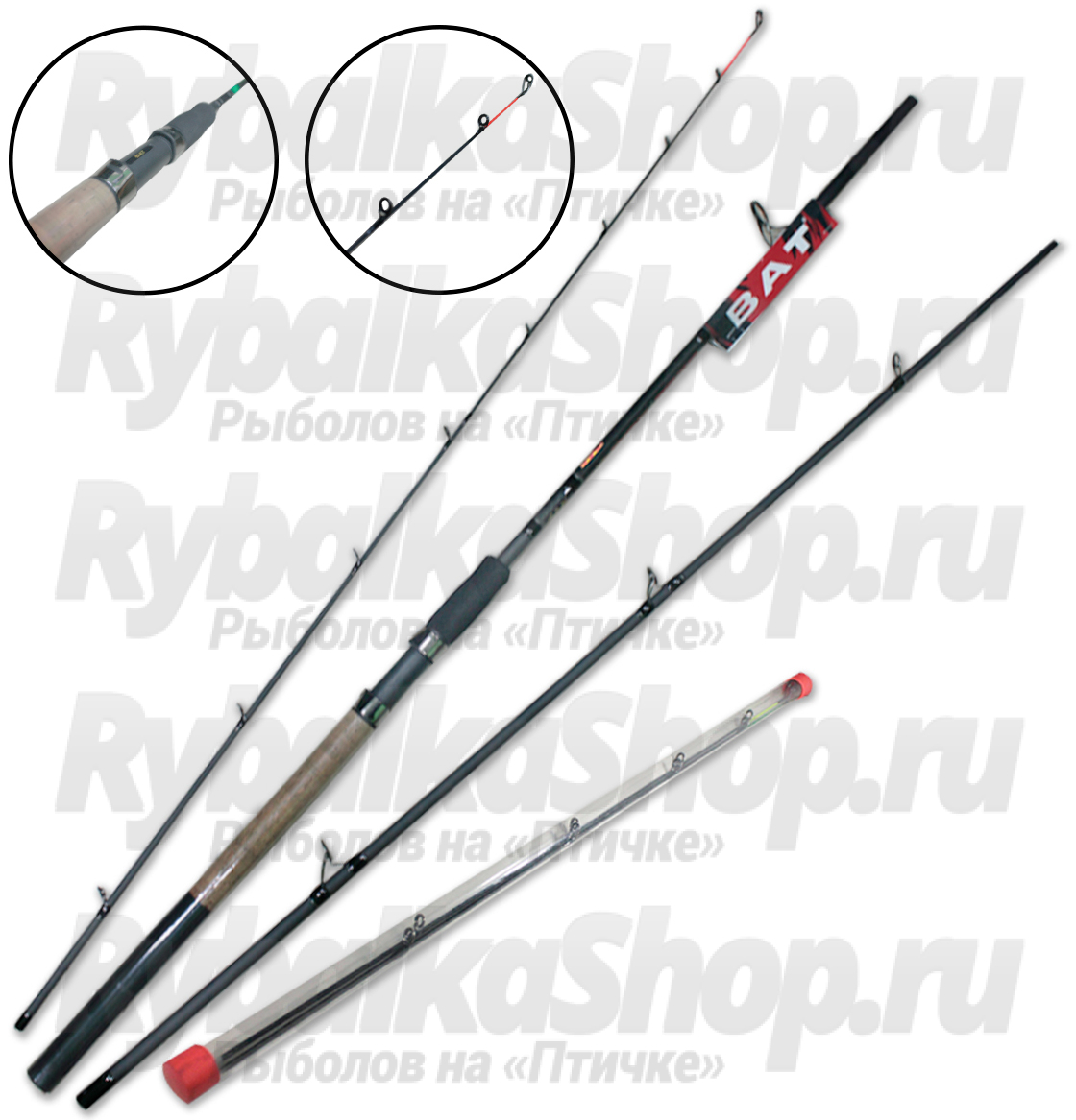 Все фидерные удилища BAT комплектуются тремя сменными хлыстиками разного теста – квивертипами. Рукоять выполнена комбинированная: EVA + пробка.