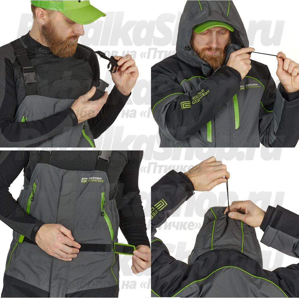 В комплекте имеется фартук. Костюм идеален для сидячей фидерной ловли, а так же для поплавочной ловли.