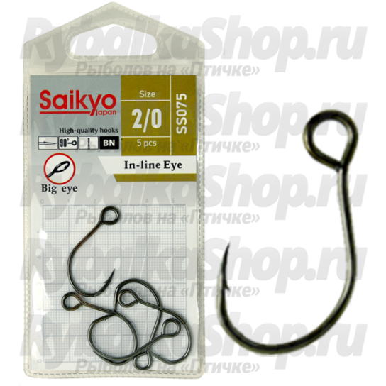 Крючки кованные Saikyo SS075-BN In-Line Eye с большим ушком. Заточка с тремя режущими кромками (Cutting point). Прямое жало крючка. Ушко развернуто на 90 градусов.