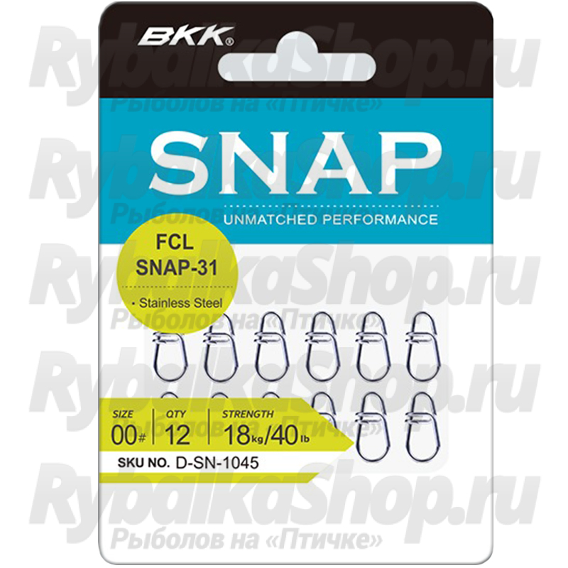 Модель BKK Fast Snap-31 имеет оригинальную конструкцию, позволяющую закрепить приманку, не открывая застежку. Она выполнена из нержавеющей стали. Проволока обладает необходимыми для подобных элементов оснастки характеристиками: не поддается коррозии, не ломается под нагрузками и за счет упругости выдерживает многочисленные циклы «открыть — закрыть». Система быстрого соединения с приманкой позволяет действовать оперативно, что обеспечивает положительный результат. Конструктивные особенности этой застежки часто помогают добиться поклевки в случае, когда хищник «бодает» приманку, но не берет ее. В этом случае имеет смысл предложить ему что-то другое. Так как модель позволяет произвести замену очень быстро, вероятность того, что рыба все еще находится в зоне ловли, довольно высока.