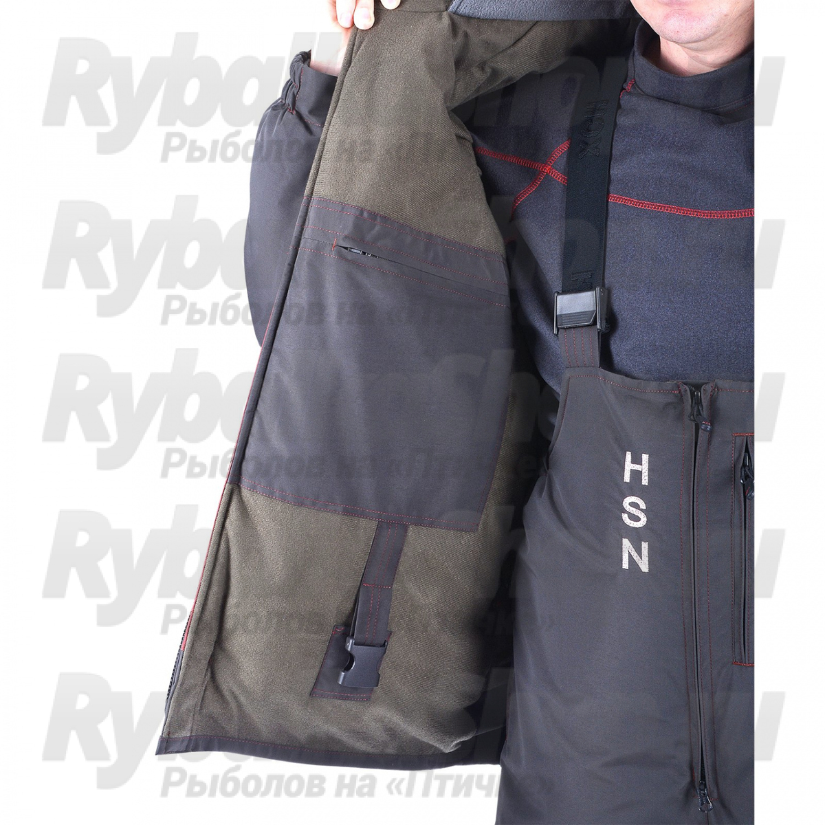 Высокий воротник куртки защищает от ветра. Удобный глубокий капюшон с жестким ветрозащитным козырьком. Глубокие утепленные карманы на куртке специально созданы для размещения всего необходимого для рыбалки и согрева рук. На рукавах есть специальные крепления для спасалок (идут в комплекте с костюмом) для оперативного использования в случае падения со льда в воду. Перфорация ткани на спинке костюма и рукавах способствует быстрому вытеканию накопившейся воды в куртке, что облегчает выход из воды при случайном падении.