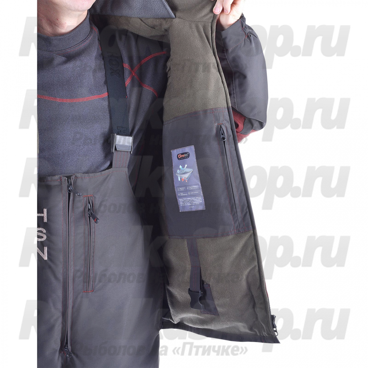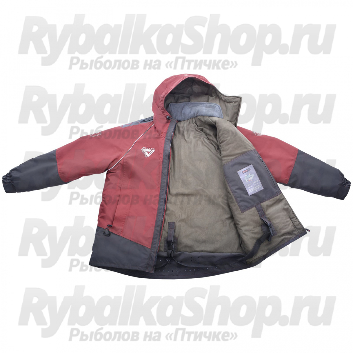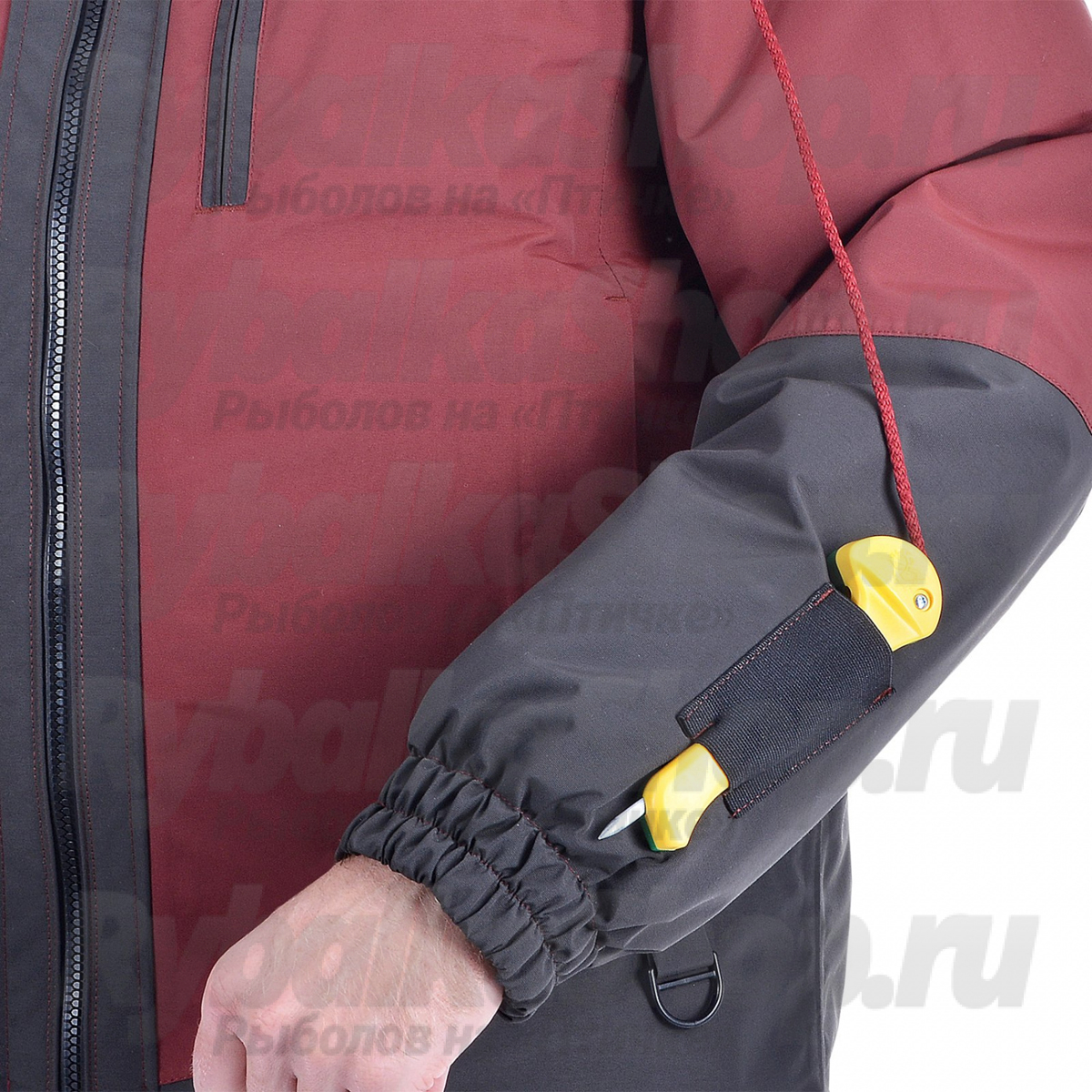 Высокий воротник куртки защищает от ветра. Удобный глубокий капюшон с жестким ветрозащитным козырьком. Глубокие утепленные карманы на куртке специально созданы для размещения всего необходимого для рыбалки и согрева рук. На рукавах есть специальные крепления для спасалок (идут в комплекте с костюмом) для оперативного использования в случае падения со льда в воду. Перфорация ткани на спинке костюма и рукавах способствует быстрому вытеканию накопившейся воды в куртке, что облегчает выход из воды при случайном падении.