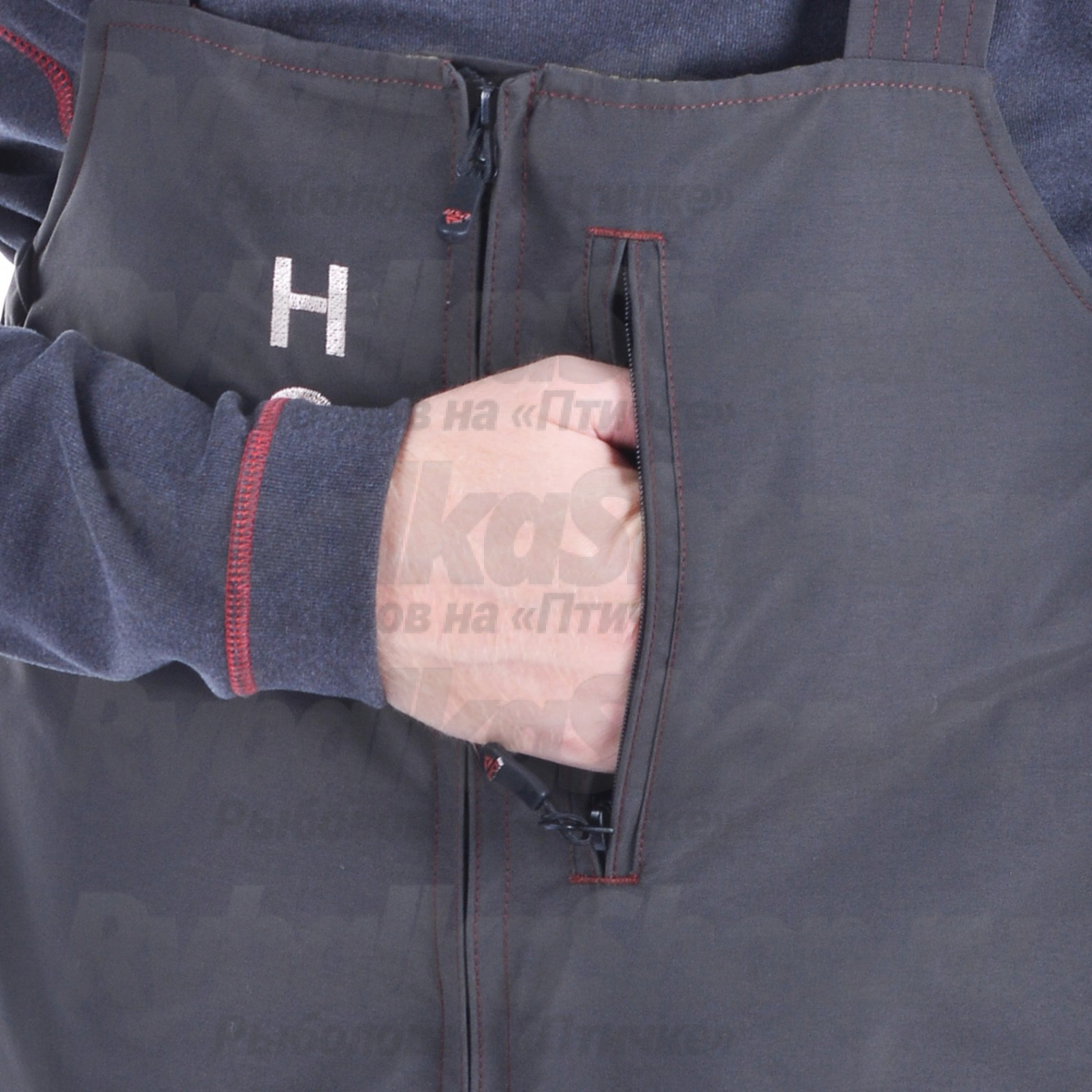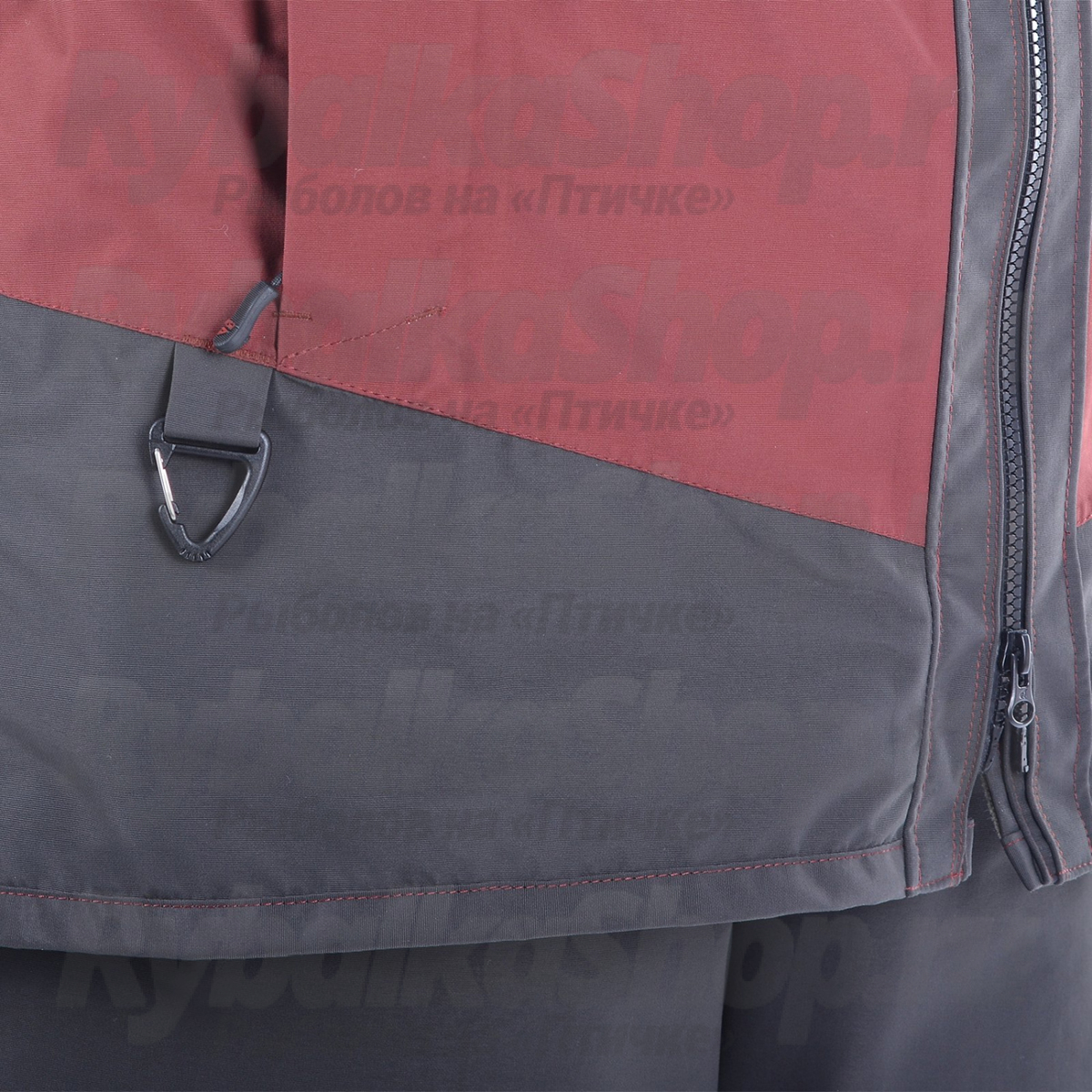Высокий воротник куртки защищает от ветра. Удобный глубокий капюшон с жестким ветрозащитным козырьком. Глубокие утепленные карманы на куртке специально созданы для размещения всего необходимого для рыбалки и согрева рук. На рукавах есть специальные крепления для спасалок (идут в комплекте с костюмом) для оперативного использования в случае падения со льда в воду. Перфорация ткани на спинке костюма и рукавах способствует быстрому вытеканию накопившейся воды в куртке, что облегчает выход из воды при случайном падении.