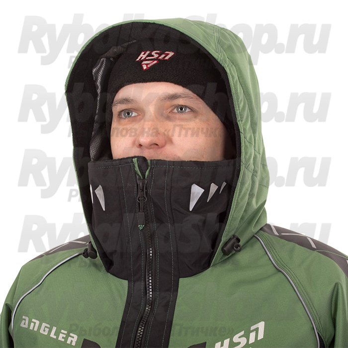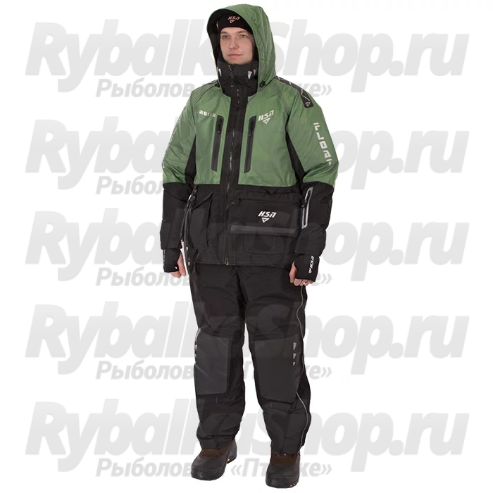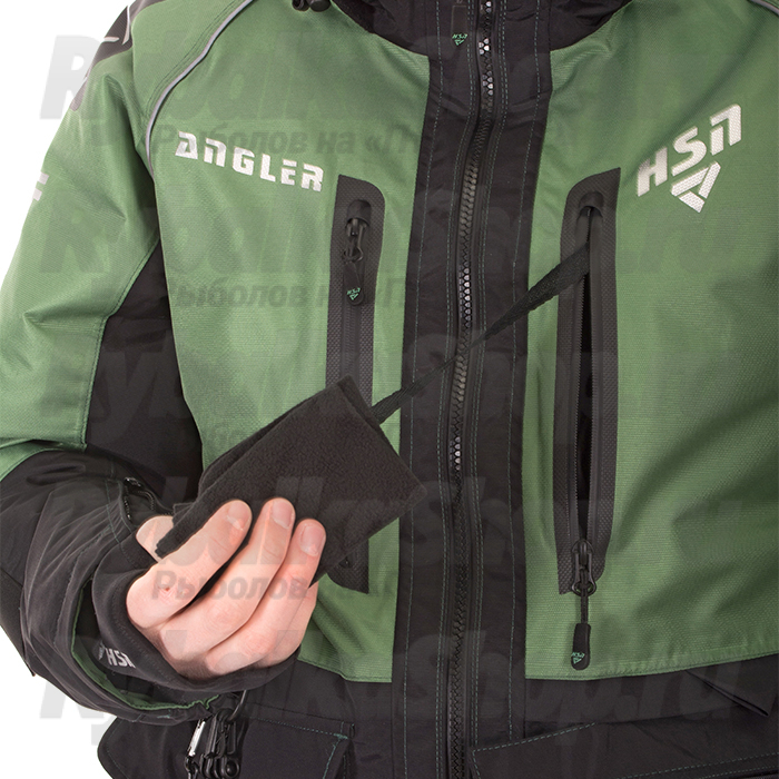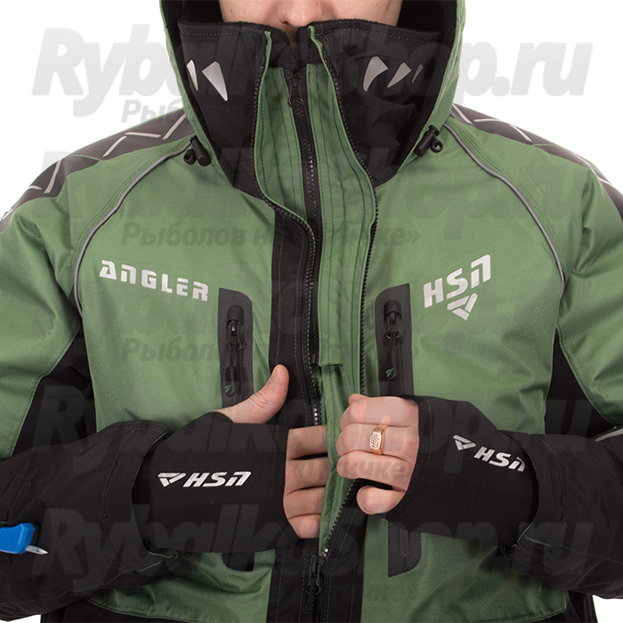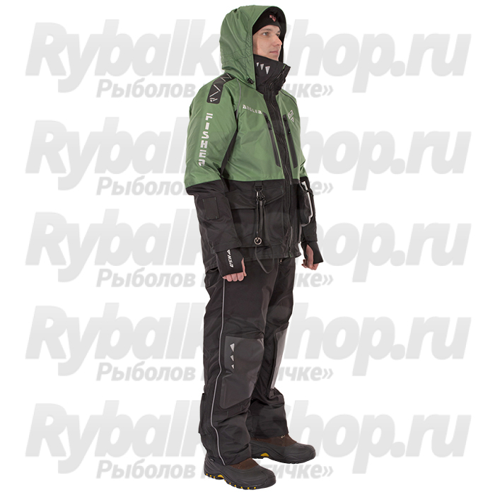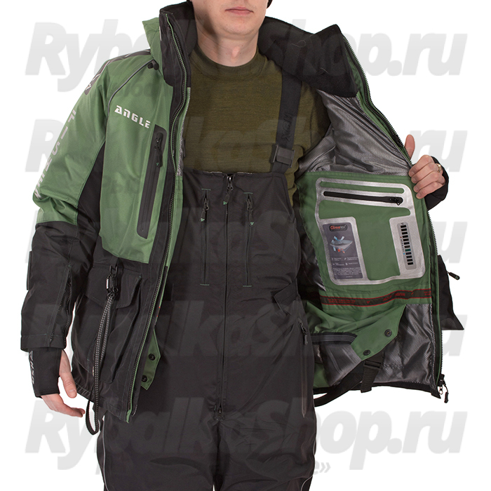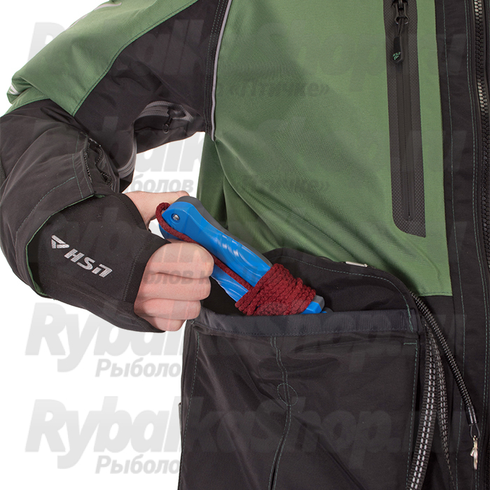 Высокий воротник куртки защищает от ветра. Удобный глубокий капюшон с жестким ветрозащитным козырьком. Глубокие утепленные карманы на куртке специально созданы для размещения всего необходимого для рыбалки и согрева рук. К куртке пристегивается дополнительный карман на разъемной молнии с пластиковой коробкой для приманок размером 22х12х2см. На рукавах есть специальные крепления для спасалок (идут в комплекте с костюмом) для оперативного использования в случае падения со льда в воду. Неопреновые манжеты обеспечат максимальный комфорт рукам при соприкосновении с водой. Перфорация ткани на спинке костюма и рукавах способствует быстрому вытеканию накопившейся воды в куртке, что облегчает выход из воды при случайном падении. Внутри куртки на подкладе - влагостойкий карман для обеспечения сохранности гаджетов.