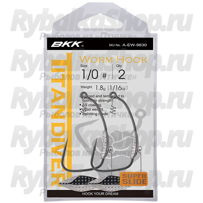 BKK Titan Diver — серия мощных крючков для больших приманок и ловли крупных рыб от всемирно известного бренда BKK. Они являются модифицированной версией серии Titan 9006, в которую была добавлена свинцовая огрузка и лепесток для дополнительного привлечения рыбы. Офсетник сделан из высокоуглеродистой стали с тефлоновым покрытием Super Slide, что обеспечивает колоссальный запас мощности крючка, устойчивость к коррозии и долговечность. Геометрия крючка разработана специально для оснащения крупных приманок и надежного удержания мощной рыбы после подсечки. Несмотря на большую толщину крючка, его жало благодаря алмазной заточке крайне острое и уверенно пробивает крепкие пасти щуки и судака. Для более удобного оснащения и минимизации повреждений приманки крючок имеет вкручивающуюся пружину, которая надежно удерживает силикон. Чтобы приманка не съезжала вниз по поддеву и не оголяла жало раньше времени, на крючке предусмотрен регулируемый резиновый фиксатор. В комплекте с крючком идут два грузила разного веса, что позволяет более точно подобрать огрузку под условия ловли и приманку. Данный грузик можно передвигать по крючку, тем самым смещая центр тяжести и меняя поведение приманки на проводке и парении. Лепесток во время движения создает дополнительные завихрения, тем самым увеличивая привлекательность приманки. BKK Titan Diver предназначен для крупных и очень крупных приманок.