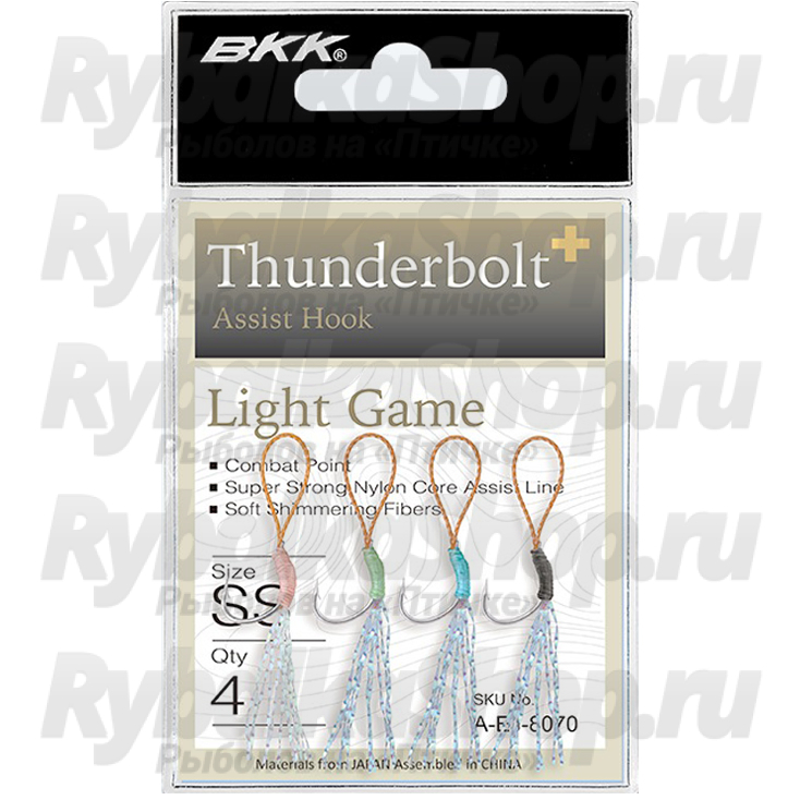 BKK Thunderbolt+ разработан для микроджига как в пресной, так и в соленой воде. Вспомогательный крюк поставляется предварительно привязанным с помощью прочной и гибкой вспомогательной лески с нейлоновым сердечником. Блестящее оловянное покрытие в сочетании с острым, как игла, концом крючка обеспечивает превосходную коррозионную стойкость в морской воде и проникающие свойства.
