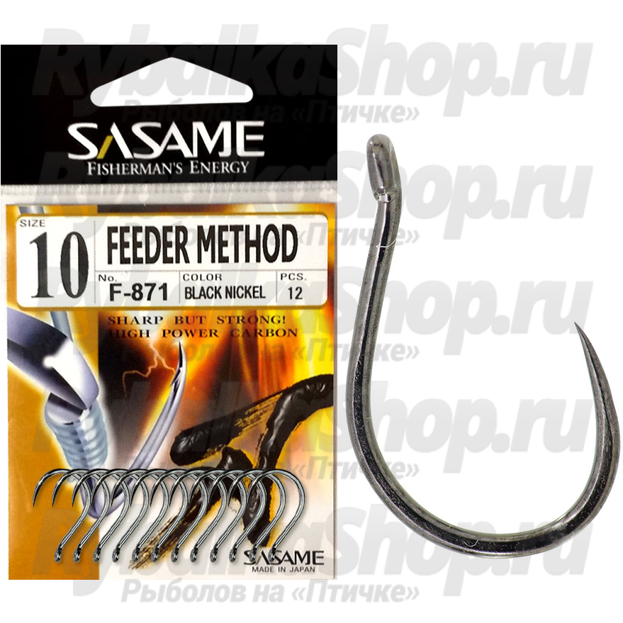Sasame FEEDER METHOD NS (F-871) - это прочный фидерный крючок классической формы, получивший черное покрытие. Его чрезвычайно острый, изогнутый кончик длинный, поэтому он глубоко вонзается и хорошо держится во рту карпа благодаря большому заливу. Крючок безбородый.