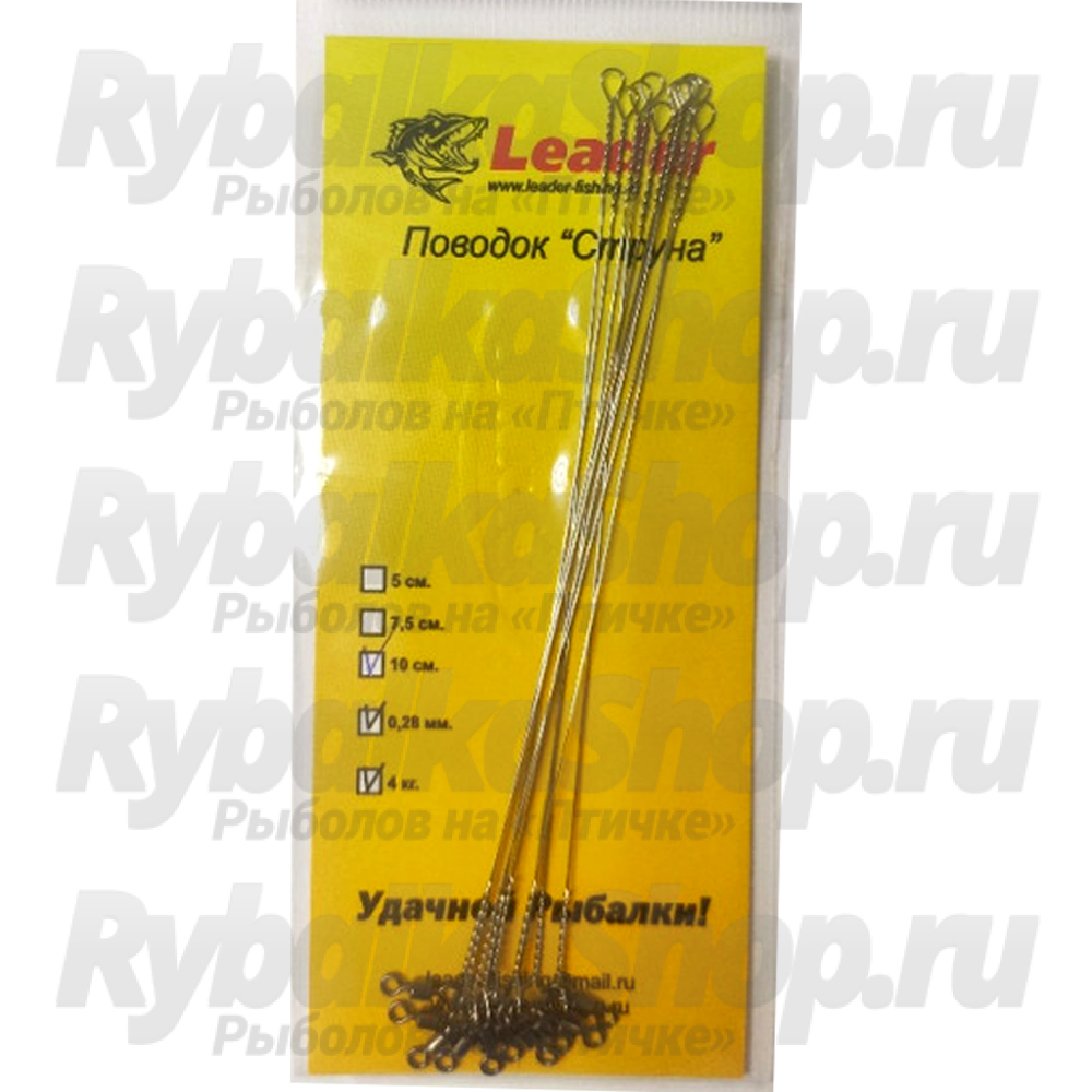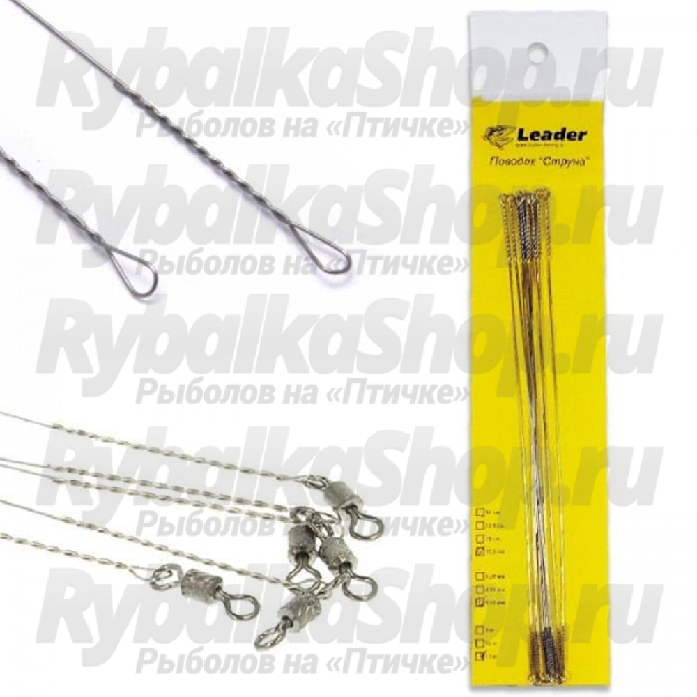 Поводок "Струна" с вертлюгом Leader Ice Fishing Поводки Leader "Струна с вертлюгом" изготовлены из качественной нержавеющей проволоки с использованием качественной фурнитуры. «Скрутка к леске», сделанная с мелким шагом предотвращает попадание шнура между витков.«Скрутка к приманке» имеет оптимальное соотношение длины и количества витков, что позволяет с легкостью осуществить монтаж, при этом не теряется прочность соединения.