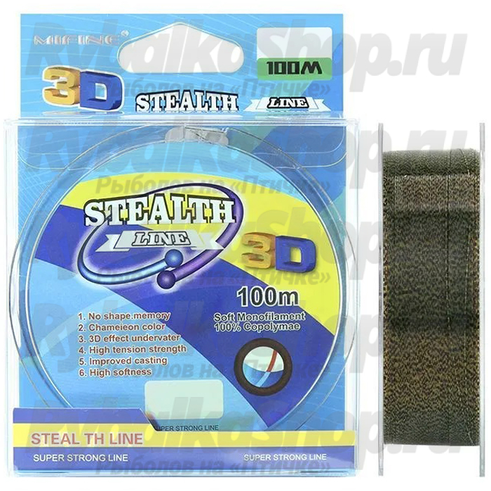 Леска Mifine Stealth Line 3d 100m была создана по специальной технологии, сочетающей использование высококачественного полимера с нанопокрытием. Она прошла строгий поэтапный контроль качества в различных термических условиях. Высокотехнологичная леска Stealth Line 3D обладает особыми оптическими эффектами, меняющими в воде её цвет и объём.