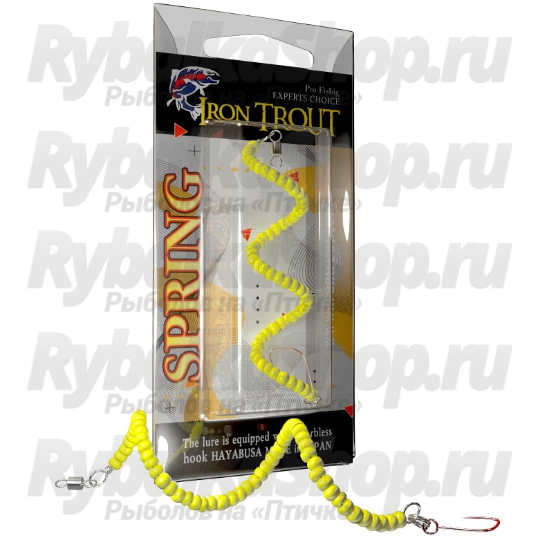 Приманка Iron Trout Spring изготовлена из высококачественной нержавеющей проволоки. Длина приманки 120 мм. Оснащается безбородым крючком HAYABUSA. Для того чтобы не было скручивания основной лески (шнура) в конструкции применен вертлюжок. После поимки или поклевки рыбы достаточно придать ей спиралевидную форму. Рекомендуемая проводка - равномерная.