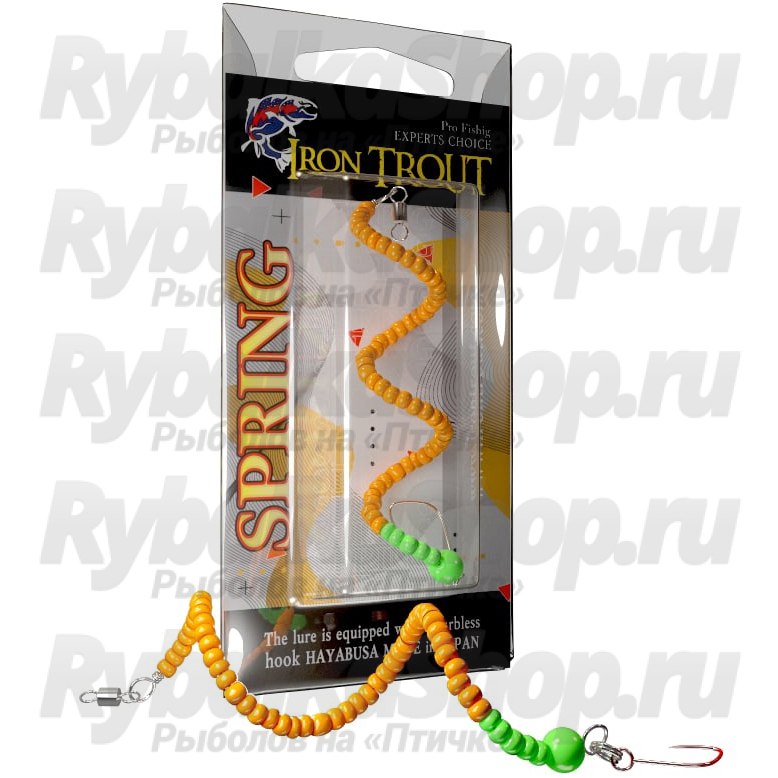 Iron Trout Spring - тонущая приманка спиралевидной формы. При проводке совершает вращательные движения вокруг своей оси. Движения приманки очень похожи на плывущего натурального червя. Отлично ловит как активную, так и пассивную форель. Изменяя длину, количество и размер витков можно добиться разнообразной игры приманки которая вынудит на поклевку самую привередливую рыбу. Отдельные модели на окончании оснащены крупными шариками 6-8 мм (точка атаки) для более эффективной ловли.