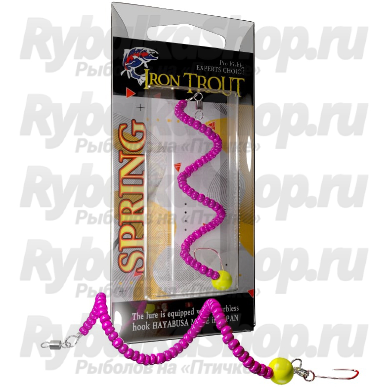 Приманка Iron Trout Spring изготовлена из высококачественной нержавеющей проволоки. Длина приманки 120 мм. Оснащается безбородым крючком HAYABUSA. Для того чтобы не было скручивания основной лески (шнура) в конструкции применен вертлюжок. После поимки или поклевки рыбы достаточно придать ей спиралевидную форму. Рекомендуемая проводка - равномерная.