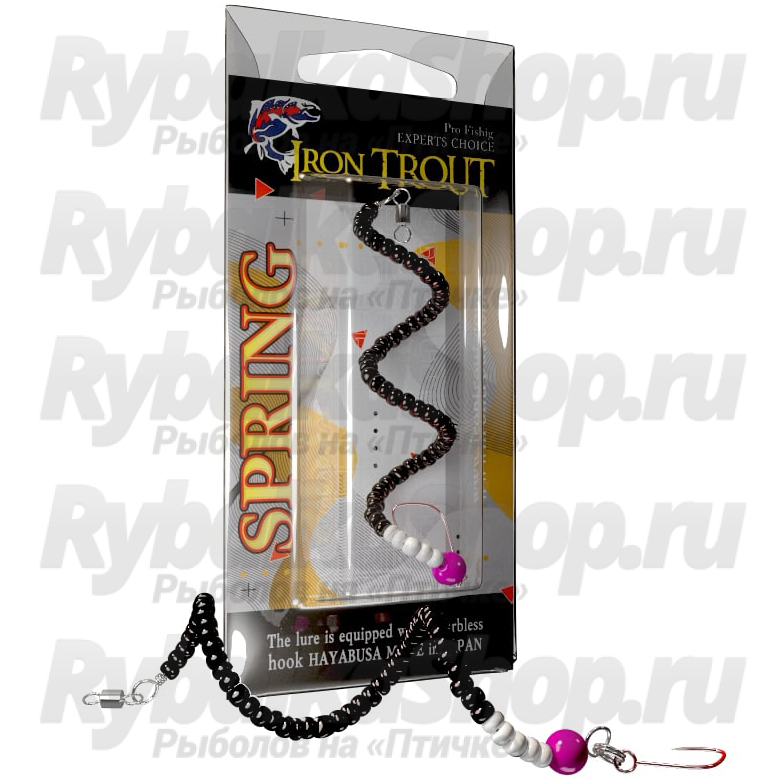 Приманка Iron Trout Spring изготовлена из высококачественной нержавеющей проволоки. Длина приманки 120 мм. Оснащается безбородым крючком HAYABUSA. Для того чтобы не было скручивания основной лески (шнура) в конструкции применен вертлюжок. После поимки или поклевки рыбы достаточно придать ей спиралевидную форму. Рекомендуемая проводка - равномерная.