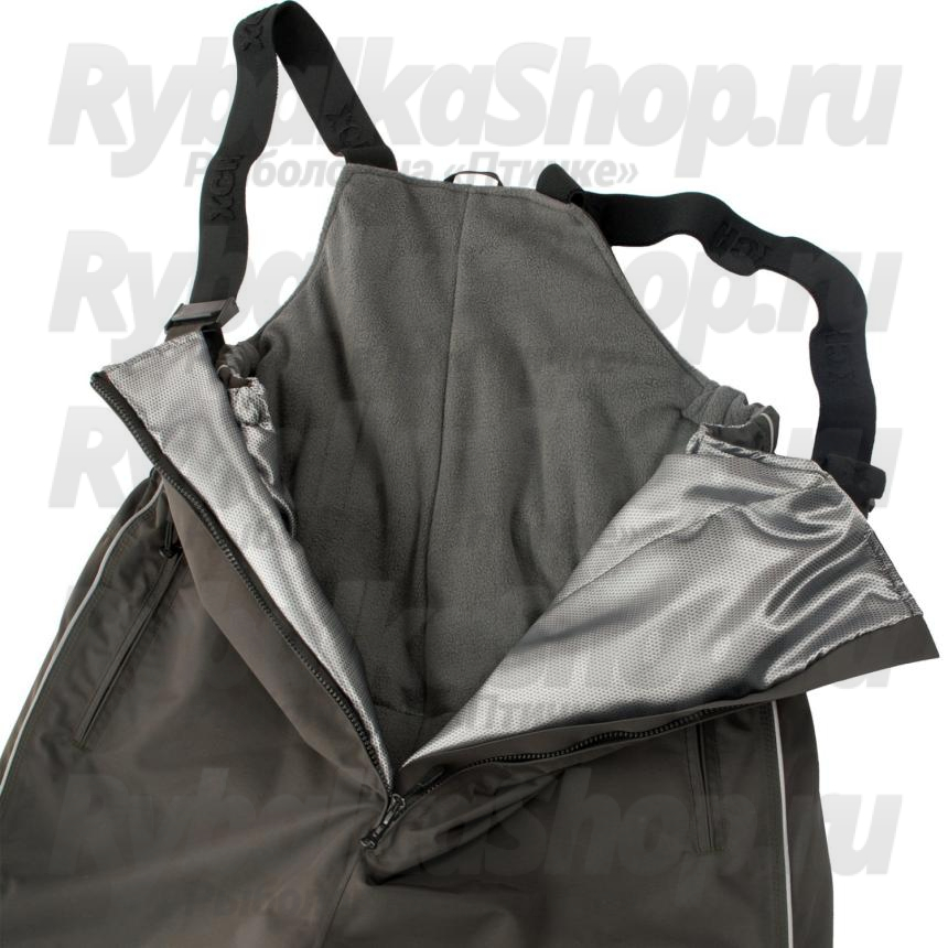 Низ полукомбинезона усилен дополнительно прочной термоустойчивой пленкой Protectfilm австрийского производства. Также изнутри полукомбинезон имеет перфорацию на подкладочной ткани для быстрого вытекания воды.