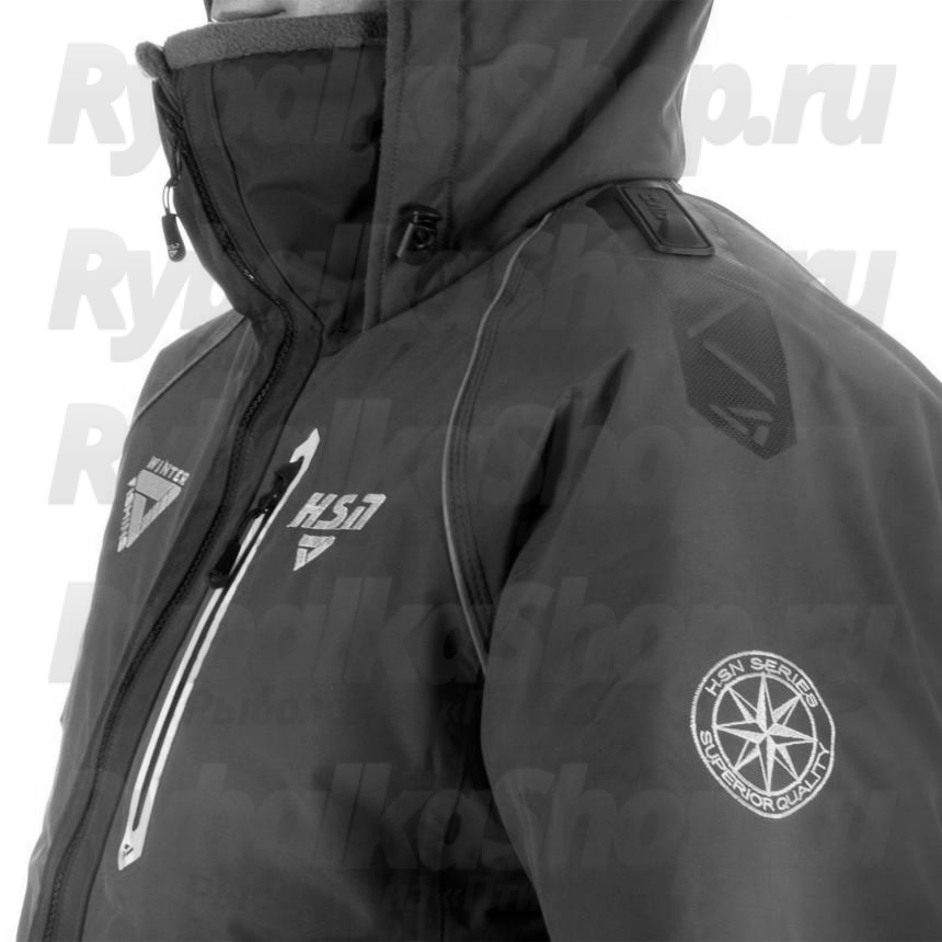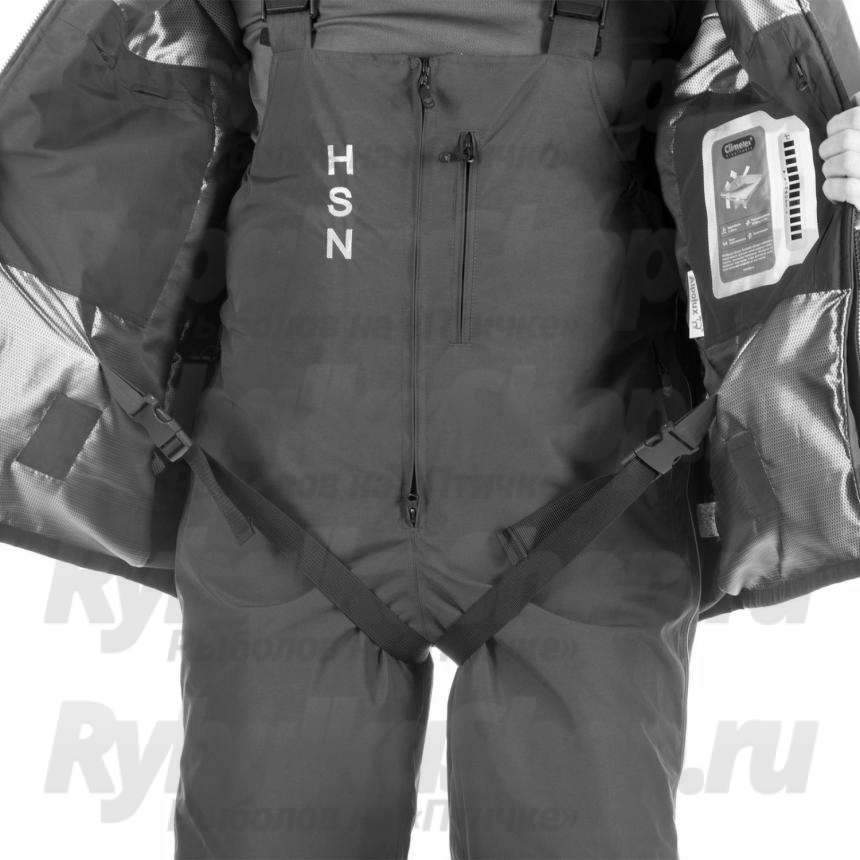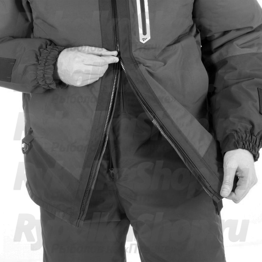 Высокий воротник куртки защищает от ветра. Удобный глубокий капюшон с жестким ветрозащитным козырьком. Глубокие утепленные карманы на куртке специально созданы для размещения всего необходимого для рыбалки и согрева рук. На рукавах есть специальные крепления для спасалок (идут в комплекте с костюмом) для оперативного использования в случае падения со льда в воду. Перфорация ткани на спинке костюма и рукавах способствует быстрому вытеканию накопившейся воды в куртке, что облегчает выход из воды при случайном падении.