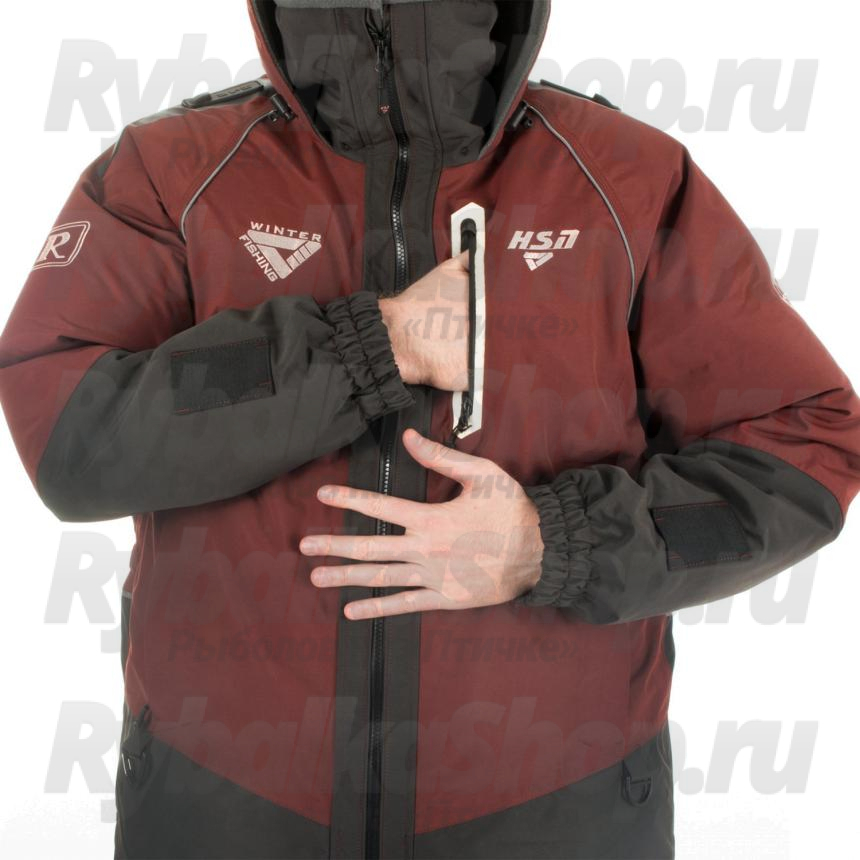 Высокий воротник куртки защищает от ветра. Удобный глубокий капюшон с жестким ветрозащитным козырьком. Глубокие утепленные карманы на куртке специально созданы для размещения всего необходимого для рыбалки и согрева рук. На рукавах есть специальные крепления для спасалок (идут в комплекте с костюмом) для оперативного использования в случае падения со льда в воду. Перфорация ткани на спинке костюма и рукавах способствует быстрому вытеканию накопившейся воды в куртке, что облегчает выход из воды при случайном падении.