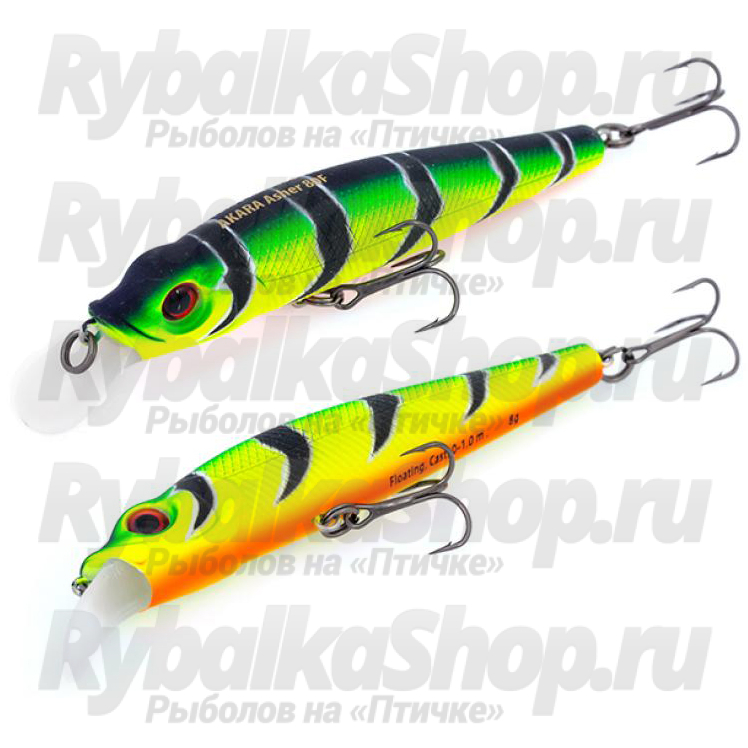 Универсальная модель Akara Asher заглубляется на расстояние до метра при ловле с берега. Можно также применять ее для троллинга. Приманка плавающая, во время паузы поднимается выше горизонта проводки. Такое свойство позволяет обходить препятствия под водой, избегая зацепа. Необычная форма лопасти позволяет приманке стабильно играть на рывковой проводке, равномерной, а также на течении. Универсален Asher и с точки зрения целевой рыбы – добычей может стать крупная и средняя щука, крупный окунь, небольшой судак. В серии есть модели с очень ярким, провоцирующим окрасом, а также с естественным – для разных условий ловли. Длина приманки составляет 80 мм, вес – 8 гр. Форма корпуса способствует хорошей дальности заброса.