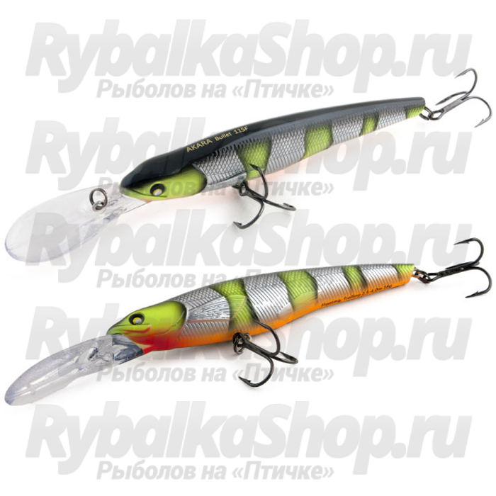 Akara Bullet 115F - троллинговый воблер класса минноу имеет неповторимую игру, которая меняется в зависимости от скорости проводки. Средняя размашистая игра при медленной проводке очень нравится щуке, а мелкая и частая дрожь при быстрой проводке эффективно работает по судаку. Плавающий. Акустический. Заглубление при троллинге 2,5 до 4,0 м.
