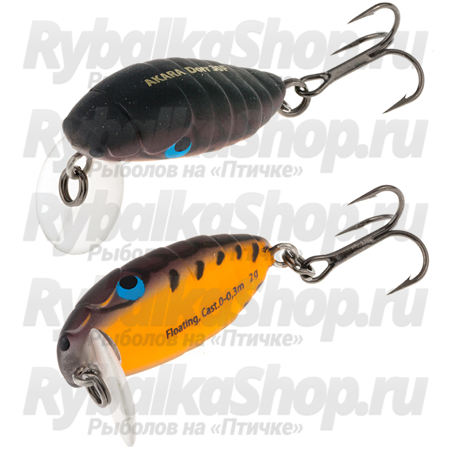 Akara Dorr 30F - небольшой воблер класса ультралайт. Имитирует собой майского жука, в том числе и по этой причине отлично подходит для охоты не только за привычным окунем, но и осторожным голавлем. Хорошо держит струю и не сбивается с игры даже в условиях достаточно сильного потока. Оснащается одним тройником. Плавающий. Заглубление при кастинге до 0,3 м.
