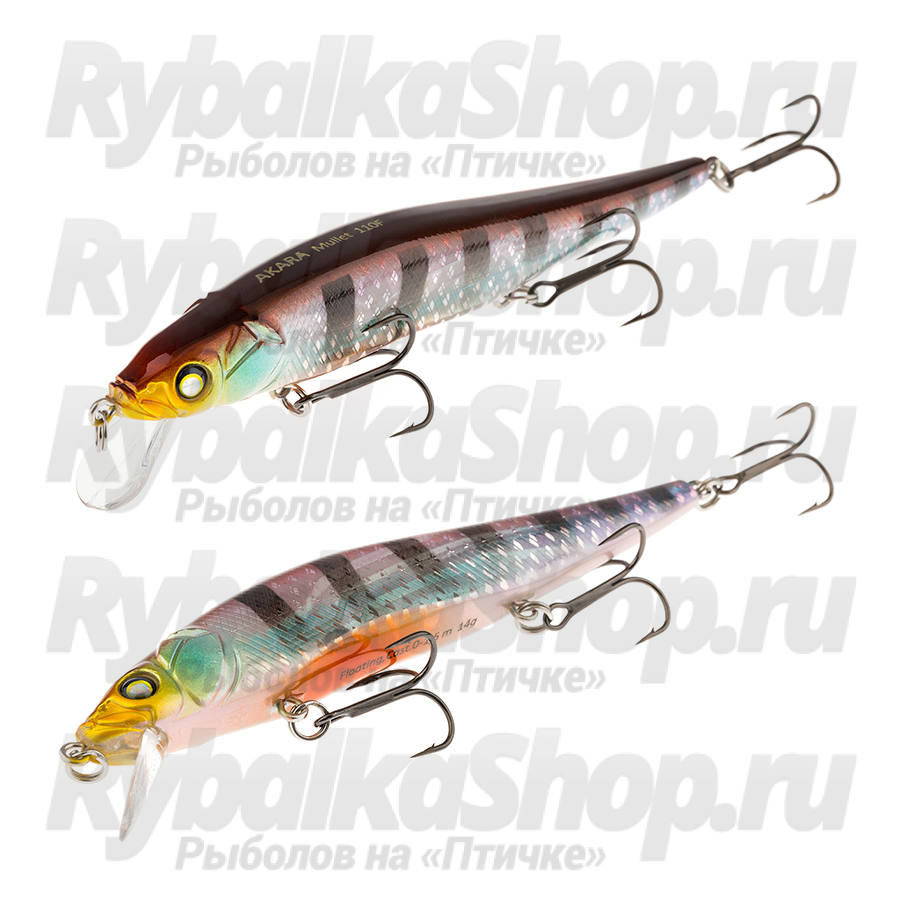 Akara Mullet 110F - плавающий воблер класса миноу для ловли твичингом. Лучшей аннимацией являются резкие рывки с короткими паузами. Отлично показал себя при ловле щуки на небольших глубинах, а так же судака на мелководье в вечернее время. Акустический. Кастинг 0 до 1,5 м.